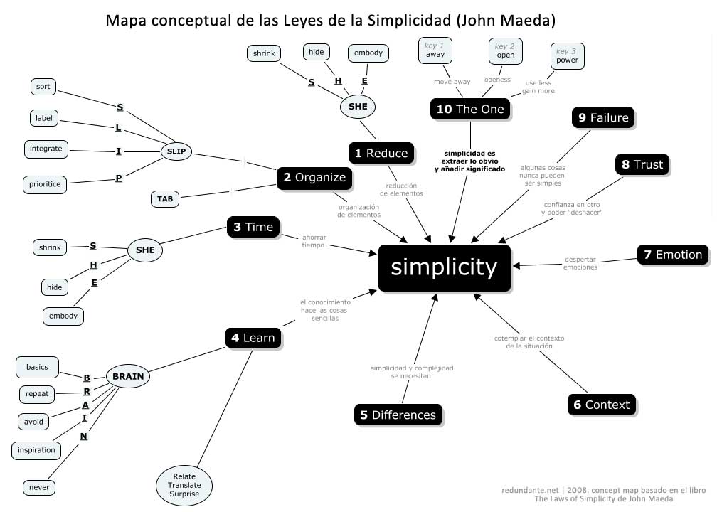 John Maeda en su libro “Las leyes de la simplicidad” hace mención a 10 leyes, el cual es un magnífico ejercicio sobre una idea sencilla y potente: en un mundo complejo, menos es más.